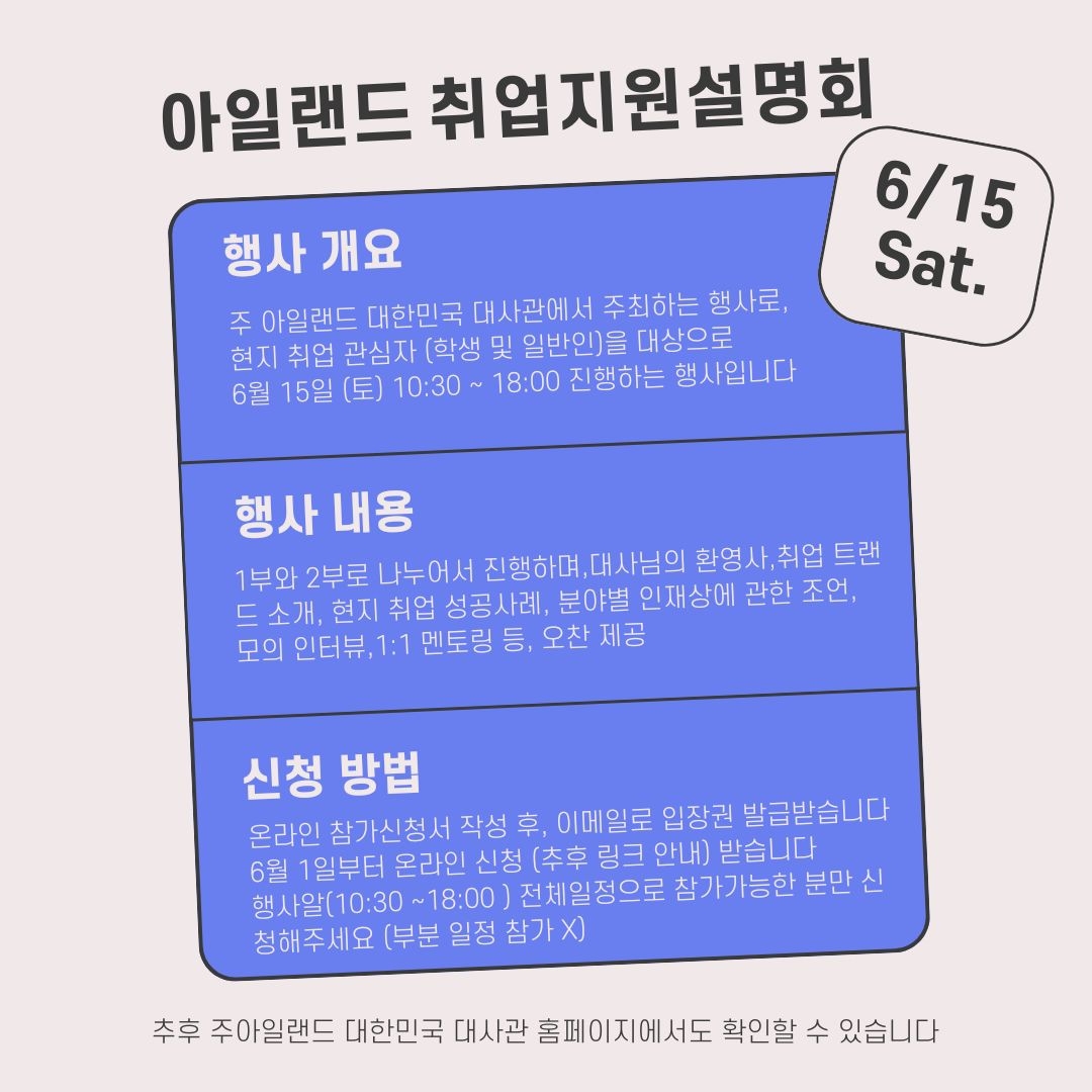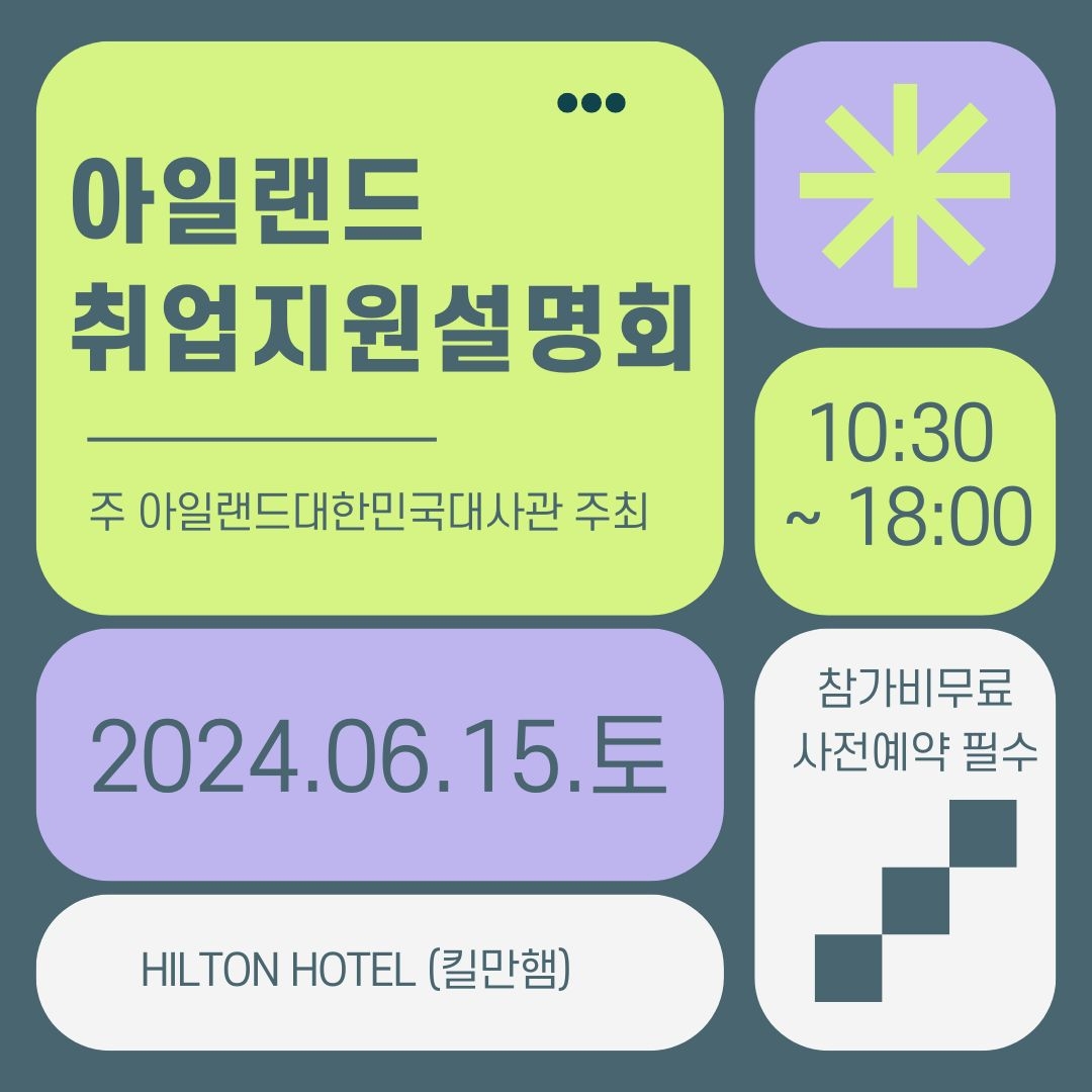 주 아일랜드 대한민국 대사관이 주최하는 [ 아일랜드 취업지원 설명회]가 2024년 6월 15일 (토) 더블린 힐튼호텔에서 진행됩니다.