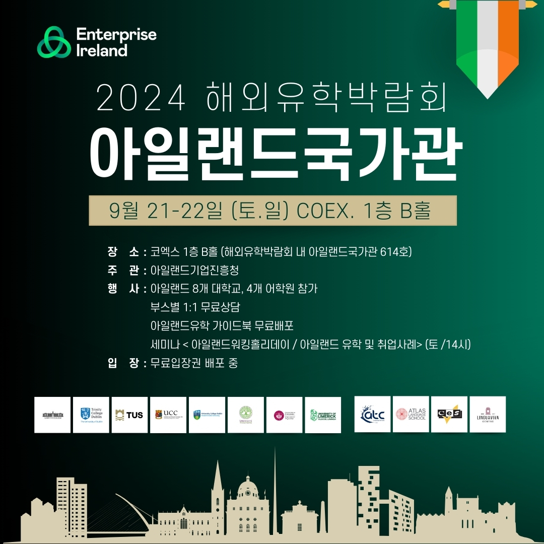 #아일랜드유학 #아일랜드어학연수 #아일랜드워홀 #해외유학박람회 #아일랜드대학 #아일랜드석사 #아일랜드어학원 #COEX유학박람회 #어학연수 #아일랜드기업진흥청 #트리니티칼리지 #UCD대학교 #코크대학교 #Griffithcollegedublin #TUS #Trinitycollegedublin #UniversitycollegeDublin #UniversitycollegeCork #UniversityofGalway #UniversityofLimerick #ATClangauageschool #Atlaslanguageschoo #CES #Centreofenlgishstudies #TheLinguavivacentre #링구아비바어학원 #CES어학원 #ATC어학원 #아틀라스어학원 #그리피스컬리지 #트리니티칼리지 #UCD대학교 #리머릭대학교 #골웨이대학교