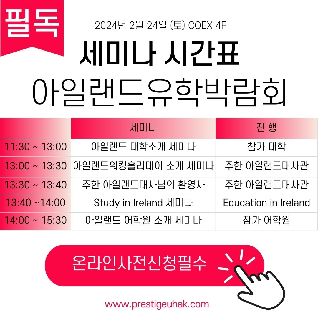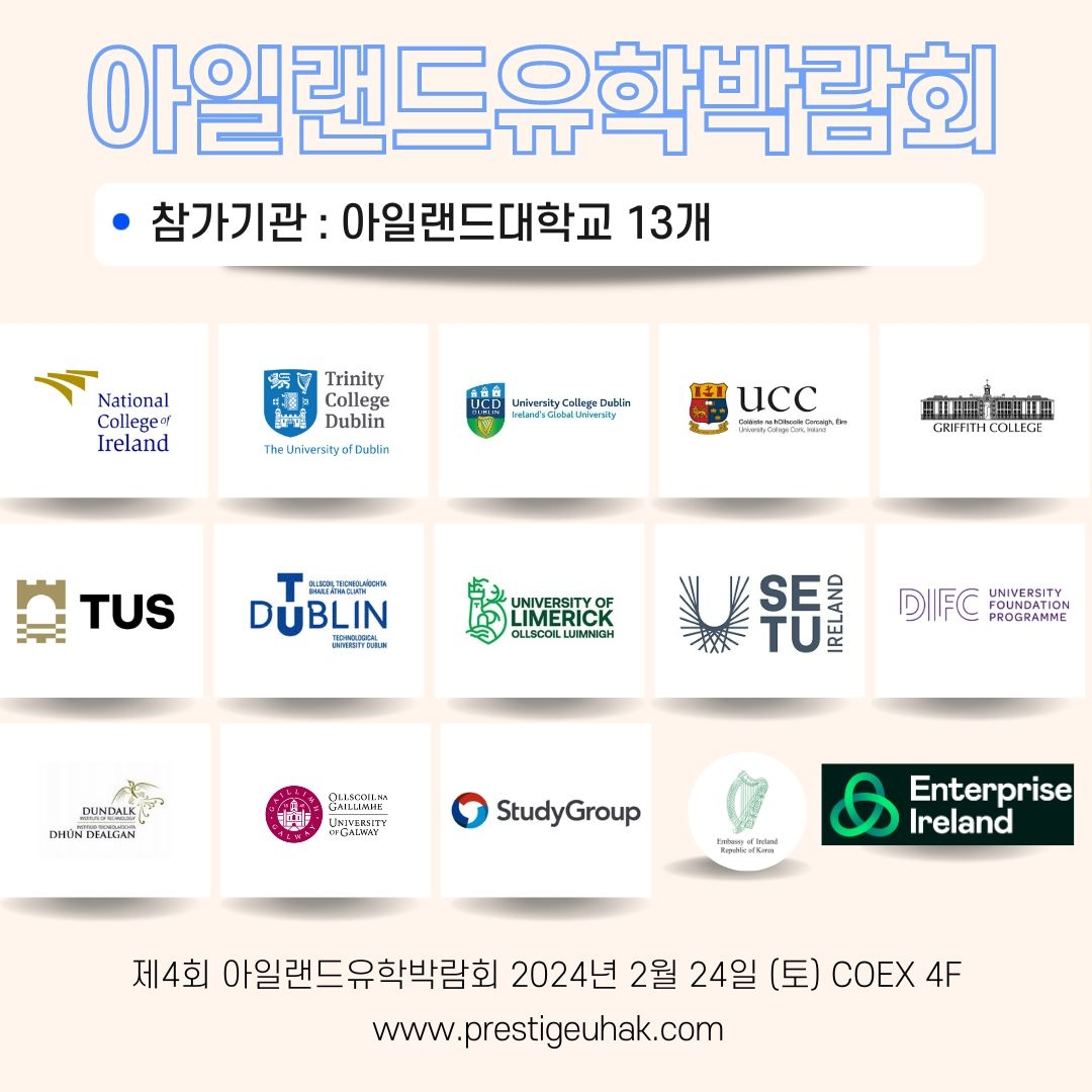 #아일랜드어학연수 #아일랜드워홀 #아일랜드유학설명회 #아일랜드유학박람회 #아일랜드유학원 #아일랜드현지유학원 #아일랜드대학 #아일랜드대학원 #아일랜드프레스티지유학 #트리니티칼리지 #trinitycollegedublin #UCD #NCI #UCC #TUDUBLIN #UCC #TUS #Griffith_college #SETU #DIFC_Foundation #NCUK #University_of_limerick #University_of_galway #DKIT #UCD파운데이션과정 #ISC #더블린대학교 #코크대학교 #그리피스컬리지 #파운데이션컬리지 #리머릭대학교 #골웨이대학교 #더블린어학원#CES #ATLAS #Emerald #Babel #EC_Dublin #Emeraldculturalinstitution #ELI #future_learning #ELI #English_path_더블린 #ISI #Linguaviva #씨이에스 #아틀라스 #에메랄드어학원 #바벨어학원 #EC_Dulin #퓨처러닝 #잉글리시패쓰 #주한아일랜드대사관 #아일랜드기업진흥청 #아일랜드프레스티지유학 #irelandprestigeuhak