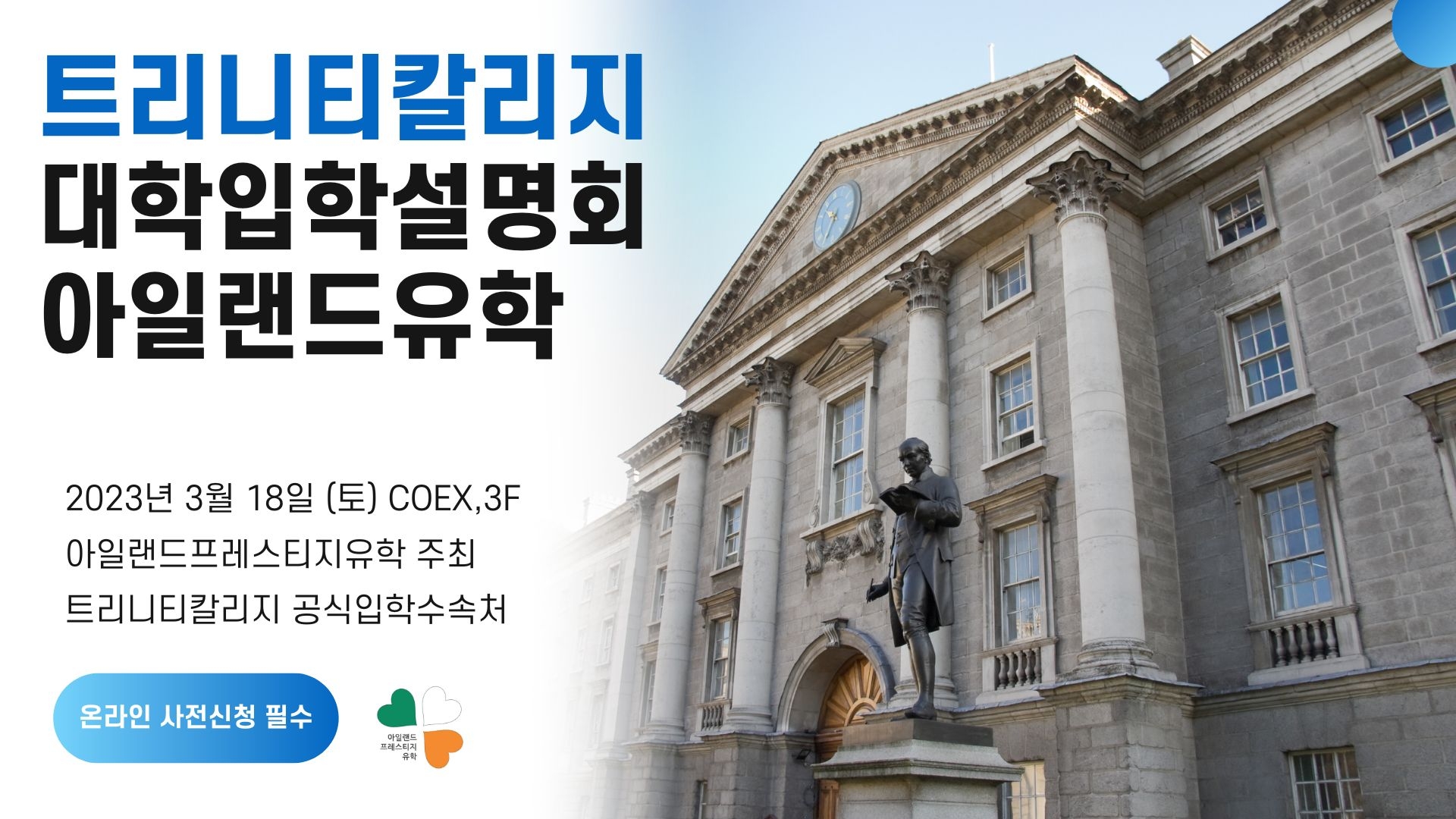 3월 18일 (토) 코엑스 컨퍼런스룸 / 트리니티칼리지 대학입학 & 아일랜드유학 설명회 (온라인 신청)